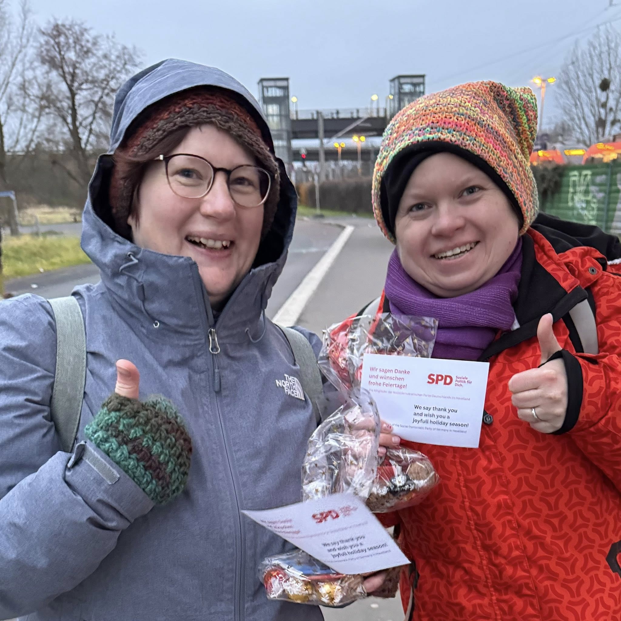 „Einfach mal Danke sagen“ war das Motto einer kleiner Weihnachtsaktion in den frühen Morgenstunden am Tag vor dem Heiligen Abend am Bahnhof in Wustermark. Ausgestattet mit 50 kleinen Päckchen konnten wir vielen Busfahrerinnen und Busfahrern eine kleine Freude machen. Vorsorglich war unser Dank auf einer kleinen Grußkarte in vielen Sprachen verfasst, was sich als sehr richtig herausstellte. Tatsächlich steuern Menschen aus sehr verschiedenen Ländern die Ersatzbusse, die die Regionalzüge auf der Strecke von Berlin nach Hamburg ersetzen. Begonnen haben die Bauarbeiten Anfang August 2025, vorgesehen sind insgesamt neun Monate Bauzeit. Natürlich haben auch die Fahrerinnen und Fahrer der normalen Linienbusse ein Päckchen bekommen.